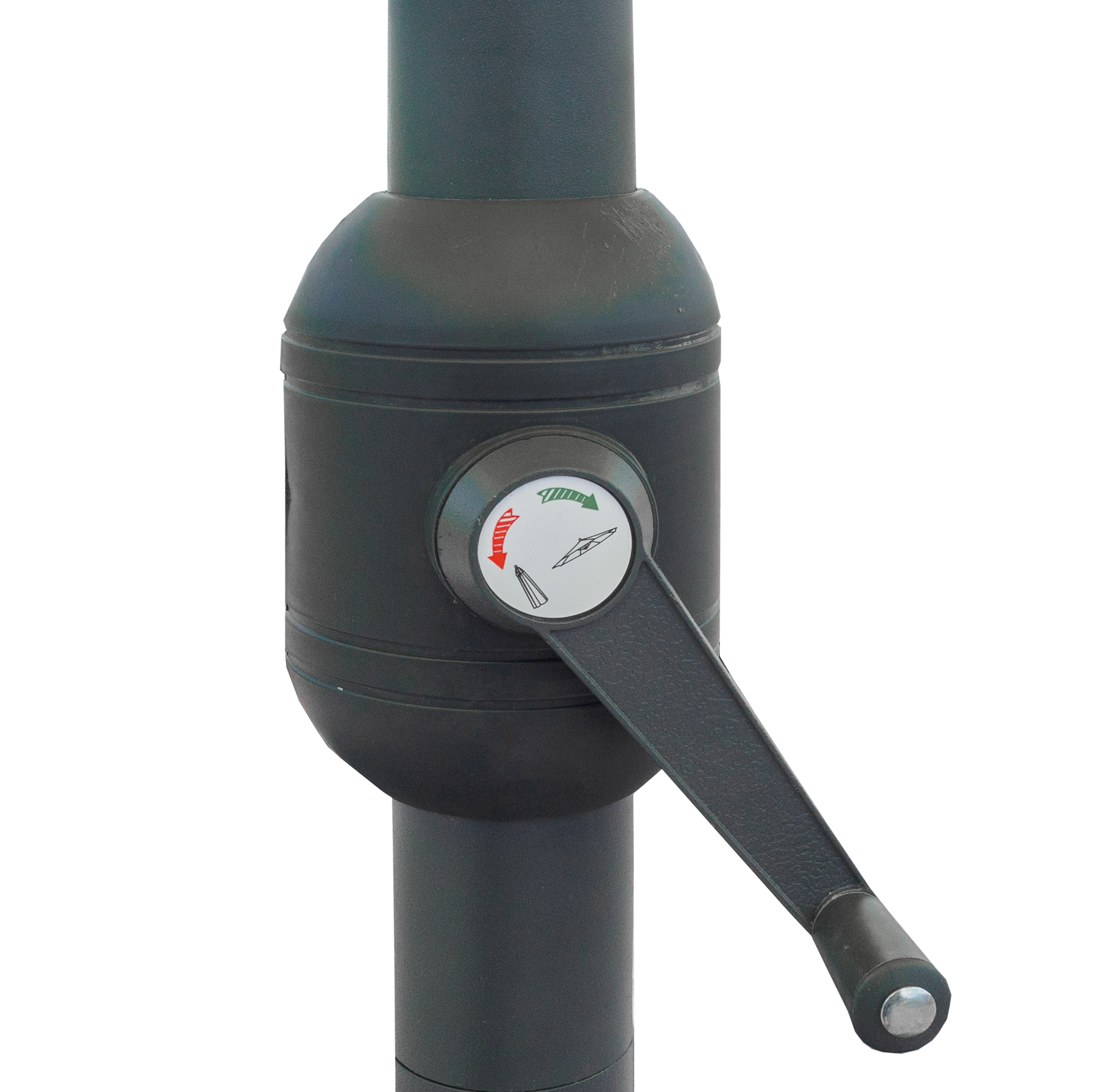 Jednoduchú manipuláciu pri rozkladaní a skladaní slnečníka zabezpečuje jednoduchý klikový mechanizmus.