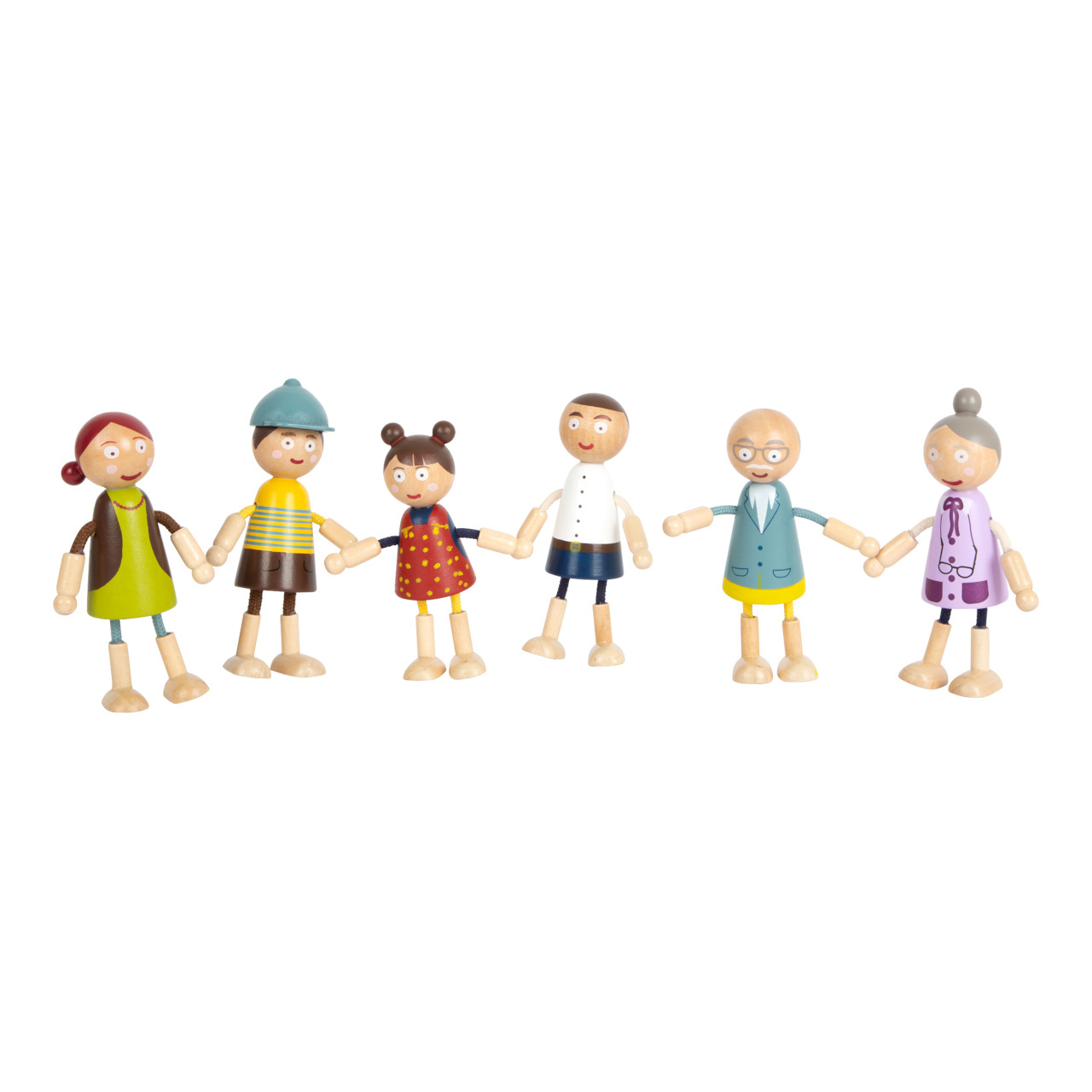 Prinášajú život do domčeka pre bábiky! Flexibilné drevené postavičky Rodina sú vyrobené z dreva a flexibilitu zabezpečujú textilom opletené drôtiky. Nájdeme tu postavičky maminky, tatinka, babičky, deda, brata a sestry. Postavičky sú veľmi odolné a vďaka ohybným častiam pohyblivé. Majú ideálnu veľkosť pre detské ruky.Hlavné vlastnosti: 6 figúrokodolné a pohyblivé