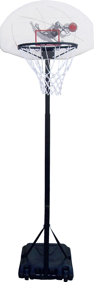 Mobilný detský basketbalový kôš s nastaviteľnou výškou, pevnou plastovou hornou časťou a obručou so sieťou, ktorá má oficiálne rozmery.