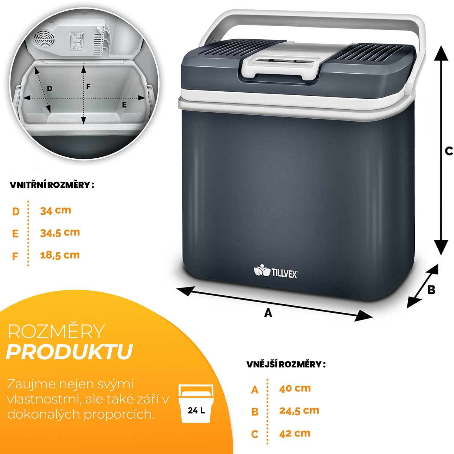 S objemom 24 litrov ponúka spotrebič dostatok priestoru na prepravu nápojov a potravín.do elektrickej skrinky možno uložiť plechovky s objemom 0,33 l a fľaše s objemom 0,5 l.