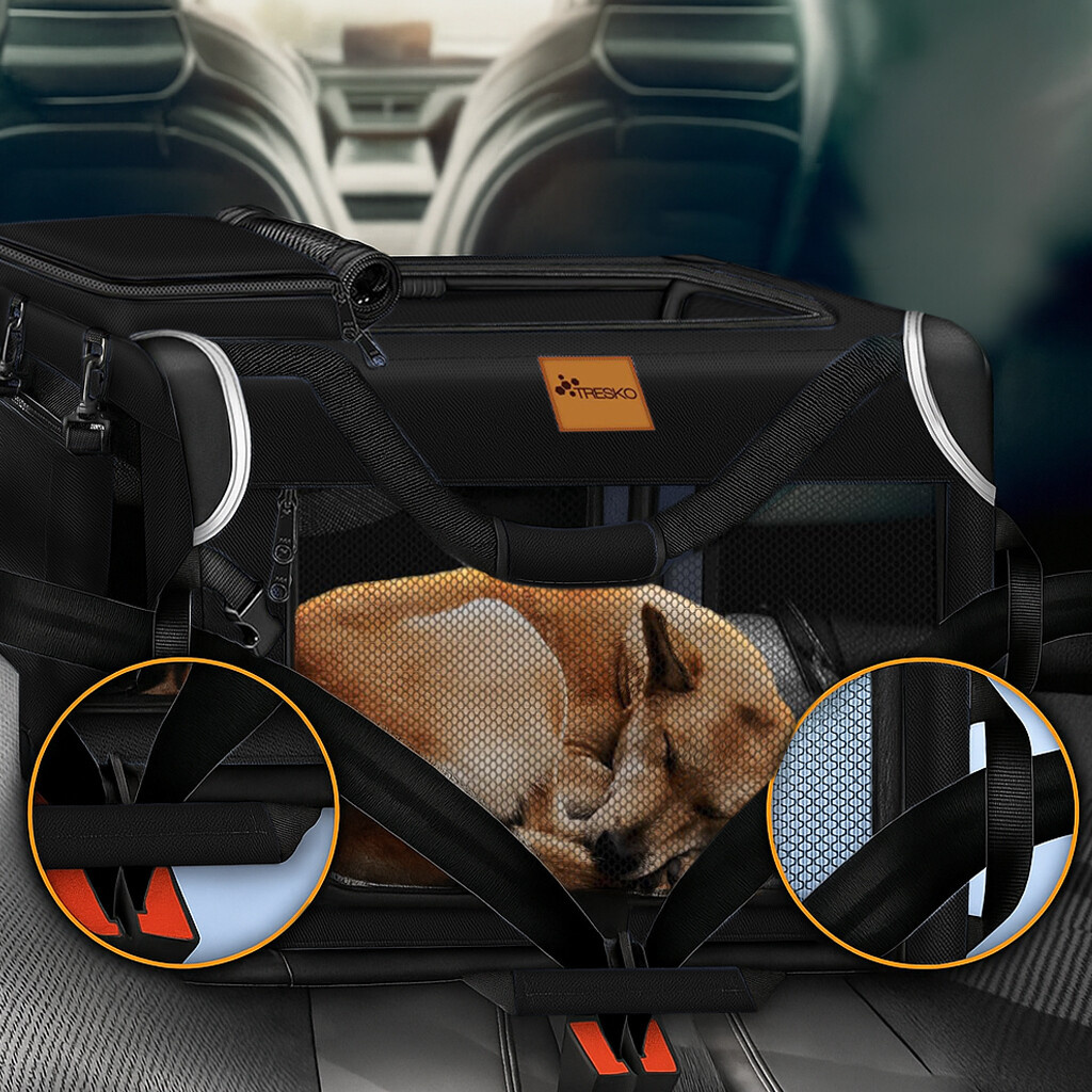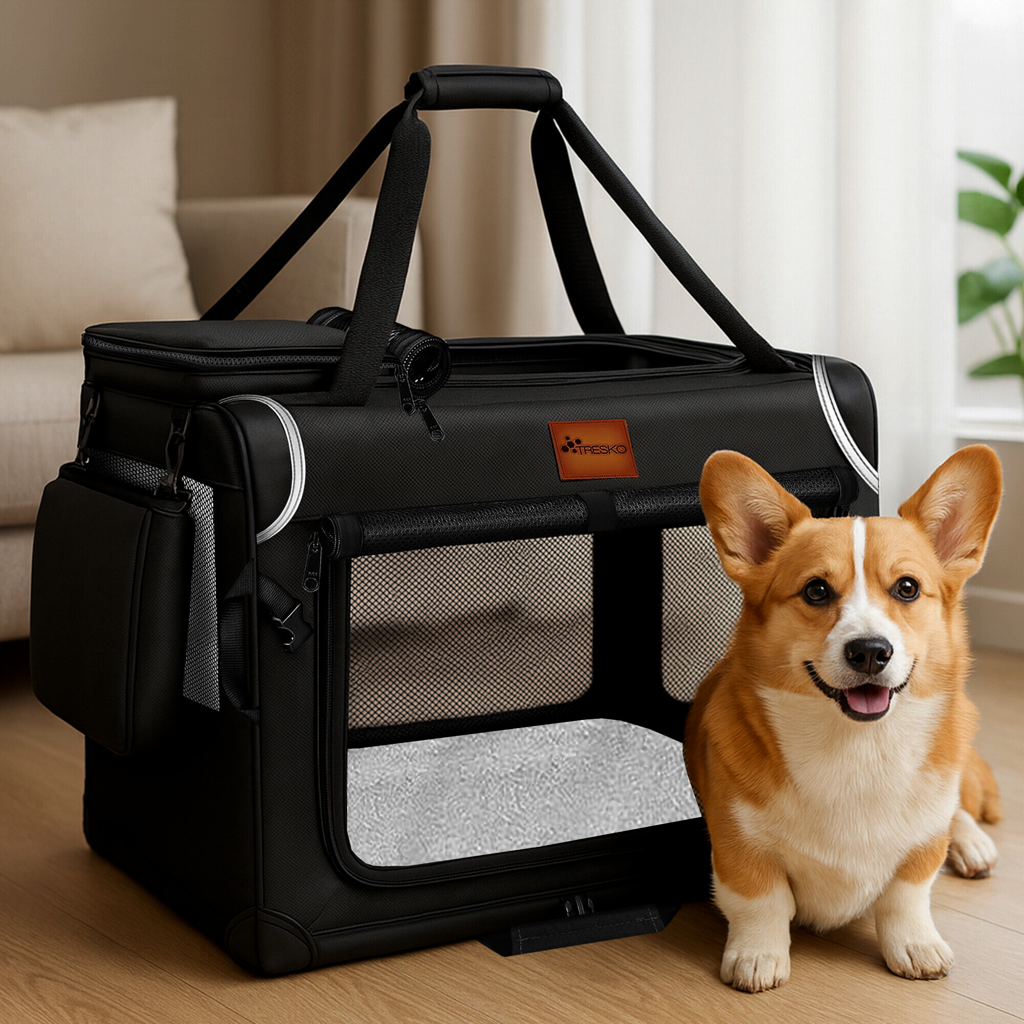 Dve priestranné vrecká sú ideálne na uskladnenie maškŕt a hračiek počas výletov k veterinárovi alebo na dovolenku. Vďaka skladacej oceľovej konštrukcii je možné prepravku rýchlo zložiť a rozložiť, čo uľahčuje jej uskladnenie a šetrí miesto. Prepravka je vyrobená z odolného materiálu 600D Oxford, ktorý je ľahko udržiavateľný.