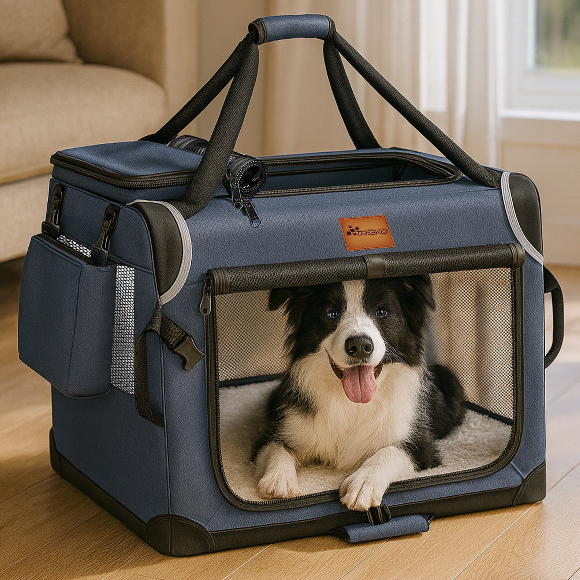 Dve priestranné vrecká sú ideálne na uskladnenie maškŕt a hračiek počas výletov k veterinárovi alebo na dovolenku. Vďaka skladacej oceľovej konštrukcii je možné prepravku rýchlo zložiť a rozložiť, čo uľahčuje jej uskladnenie a šetrí miesto. Prepravka je vyrobená z odolného materiálu 600D Oxford, ktorý je ľahko udržiavateľný.