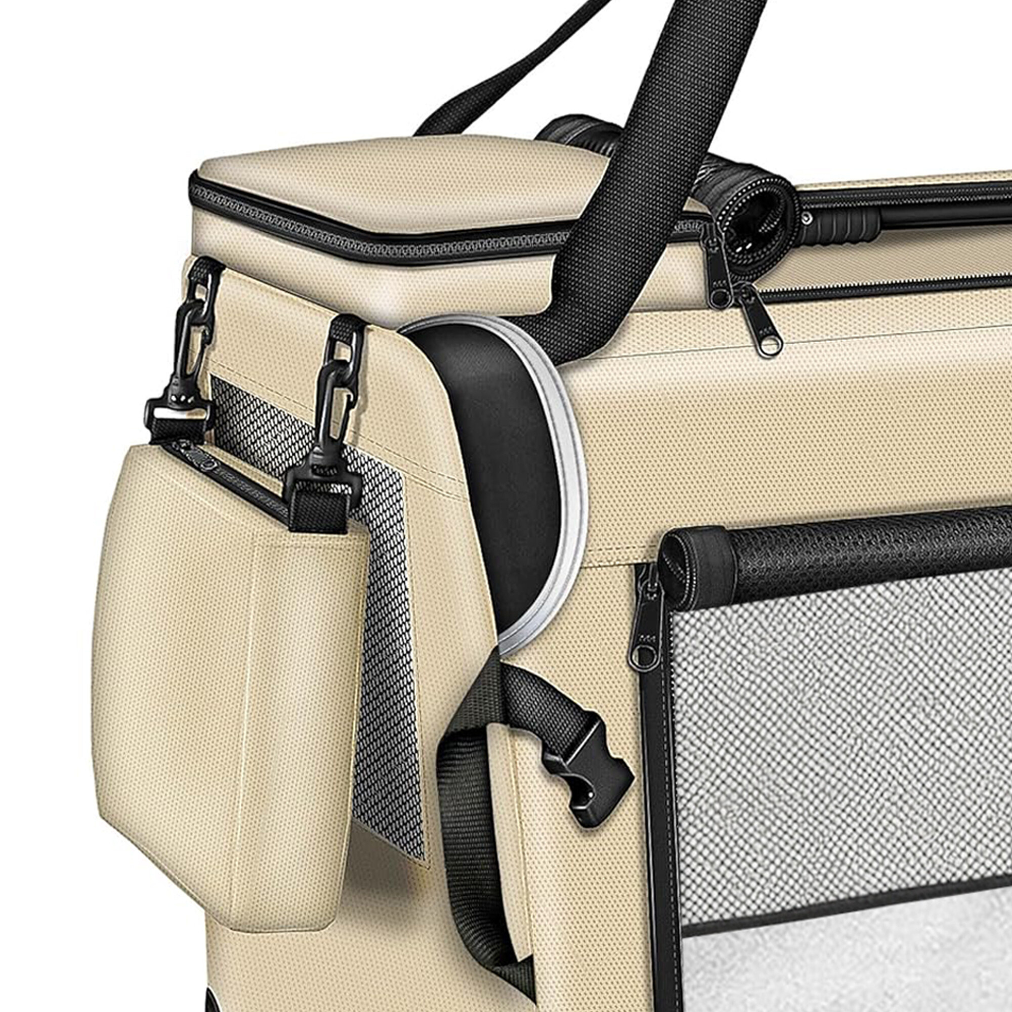 Dve priestranné vrecká sú ideálne na uskladnenie maškŕt a hračiek počas výletov k veterinárovi alebo na dovolenku. Vďaka skladacej oceľovej konštrukcii je možné prepravku rýchlo zložiť a rozložiť, čo uľahčuje jej uskladnenie a šetrí miesto. Prepravka je vyrobená z odolného materiálu 600D Oxford, ktorý je ľahko udržiavateľný.