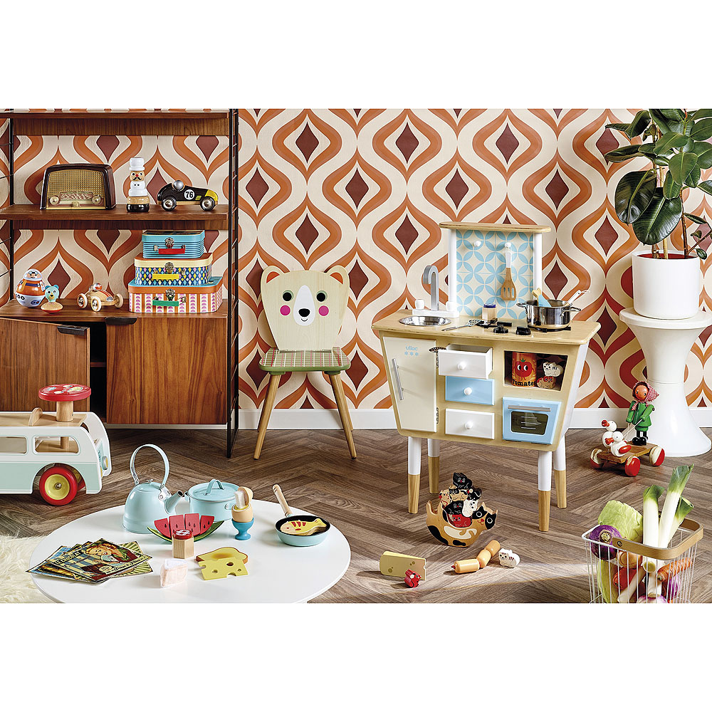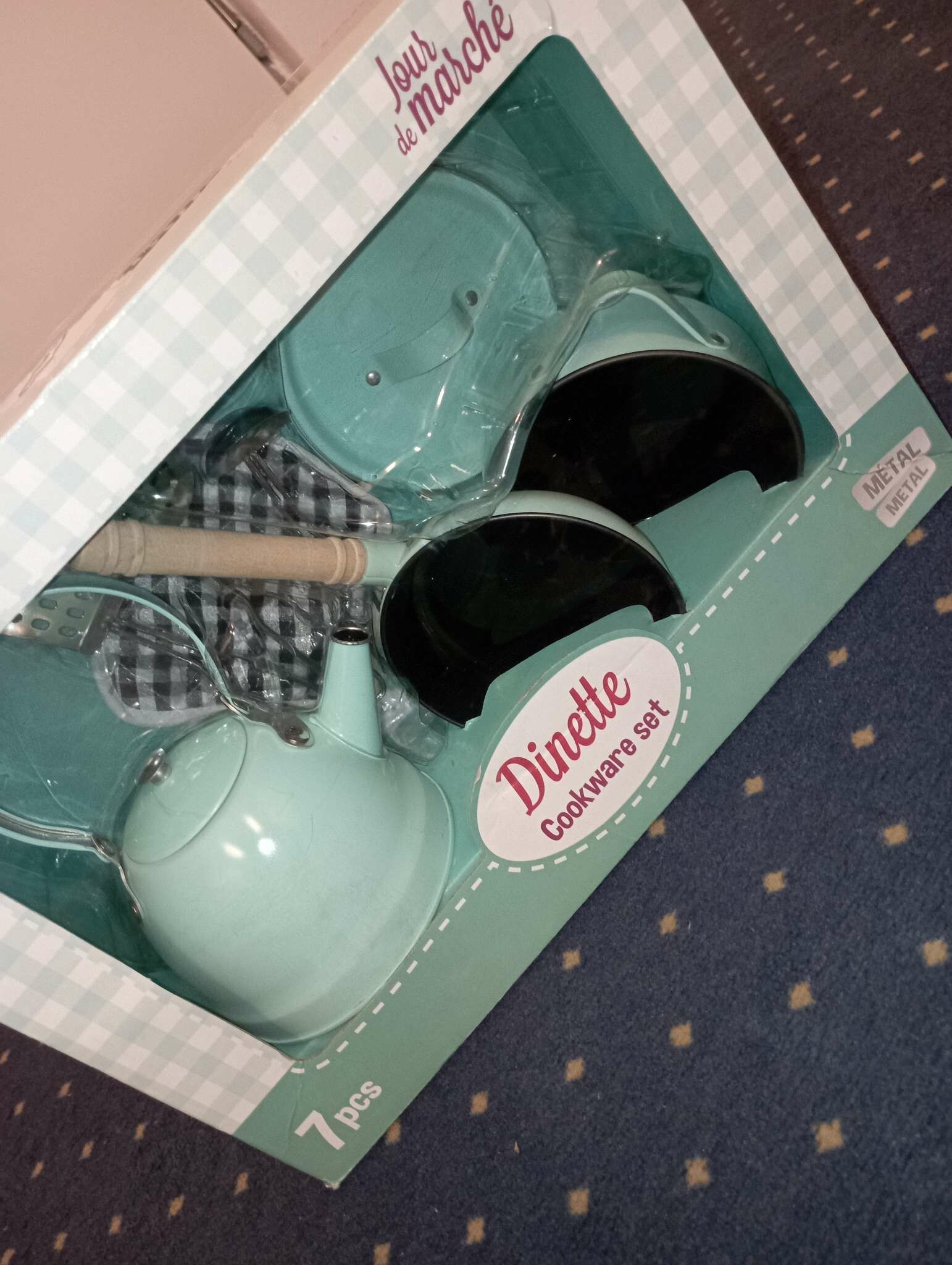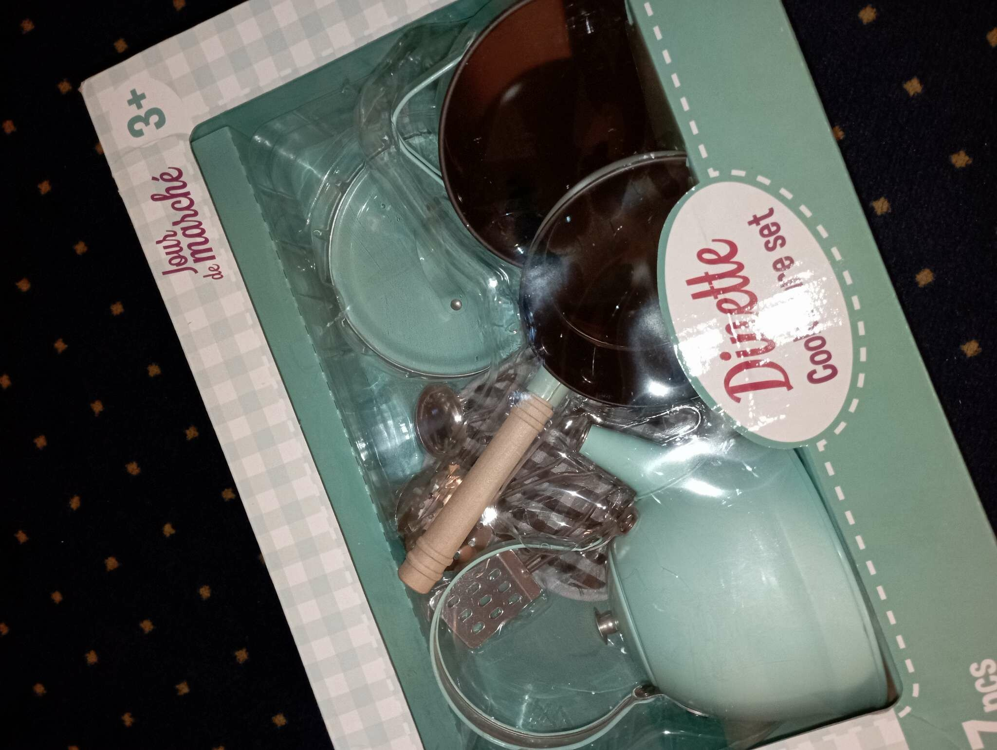 Vintage kuchynská sada z maľovaného kovu, ideálny doplnok detských kuchýň. Obsahuje panvicu, hrniec, varnú kanvicu, 2 typy naberačky a obracačku a podložku pod hrniec. Hlavné vlastnosti: vhodná do každej kuchynky